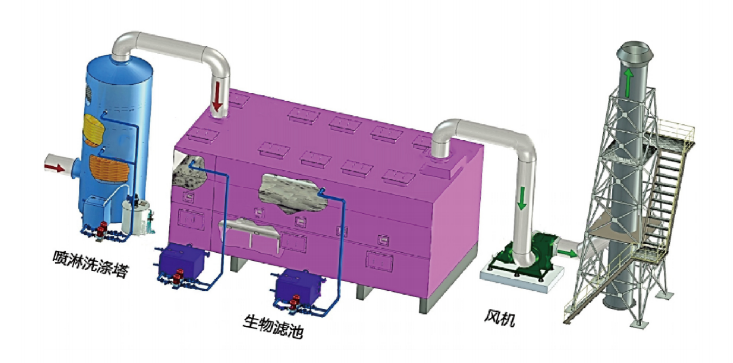 O método de filtro biológico atinge alta eficiência de desodorização e é adequado para tratar grandes volumes de gases de exaustão de baixa concentração.